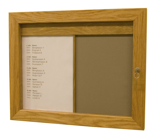 Dörren har ett 3 mm polyesterglas och är försedd med cylinderlås. Anslag kläms fast bakom invändiga polyesterglas eller sätts med nål. Skåpet finns i tre standardstorlekar plats för 1, 2 eller 3 stycken A4. Välj också mellan att endast ha ett invändigt glas eller flera. För storlek efter önskemål kontakta oss.