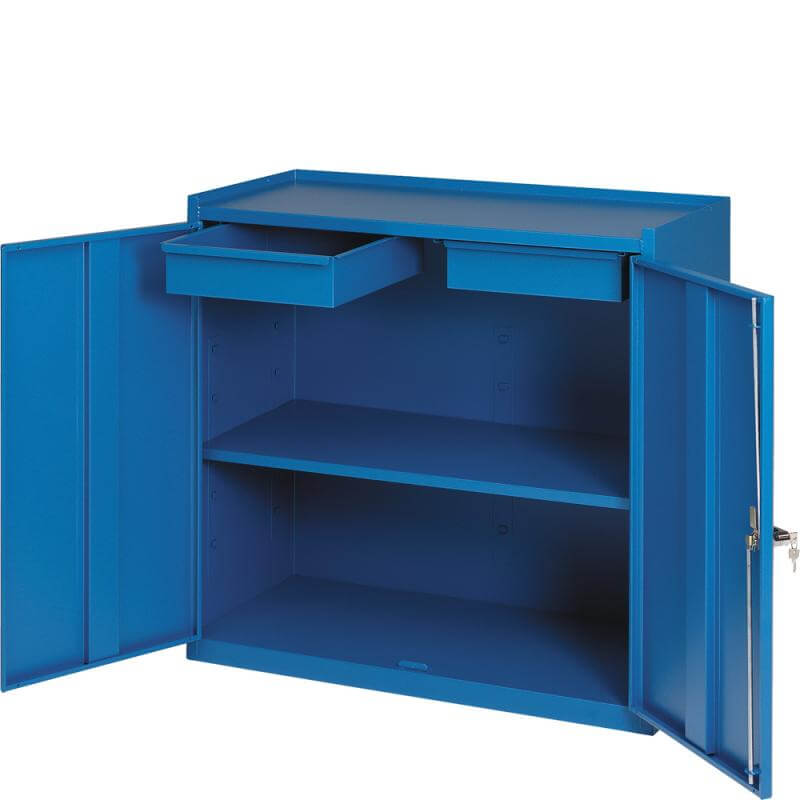 Verktygsskåp 950 x 450 x 900 mm med två låsbara dörrar och hyllstegar för montering av hyllplan.